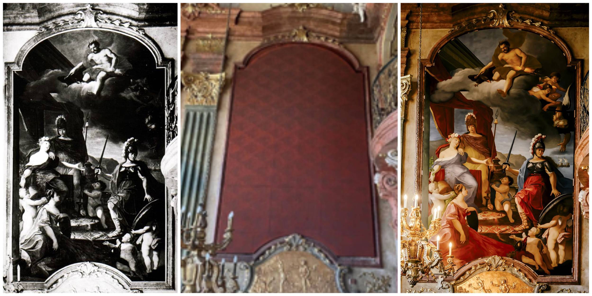 Przez kolejnych ponad trzydzieści lat turyści w ogromnych przestrzeniach ponad przejściami amfiladowymi Sali Maksymiliana mogli oglądać… zagadkowe czerwone płótna, którymi zamaskowano surowe przestrzenie po obrazach Schefflera. Ta pustka nie tylko rzutowała na estetykę wnętrza – była to przede wszystkim wielka wyrwa w przemyślanej barokowej narracji artystów pracujących nad programem ideowym rezydencji. Pustka, którą słowami wypełniali przewodnicy odwołując się do wyobraźni zwiedzających. Pustka, którą przy wielu okazjach podnosili historycy sztuki. Żeby tak wypełnić ją choć kopiami…