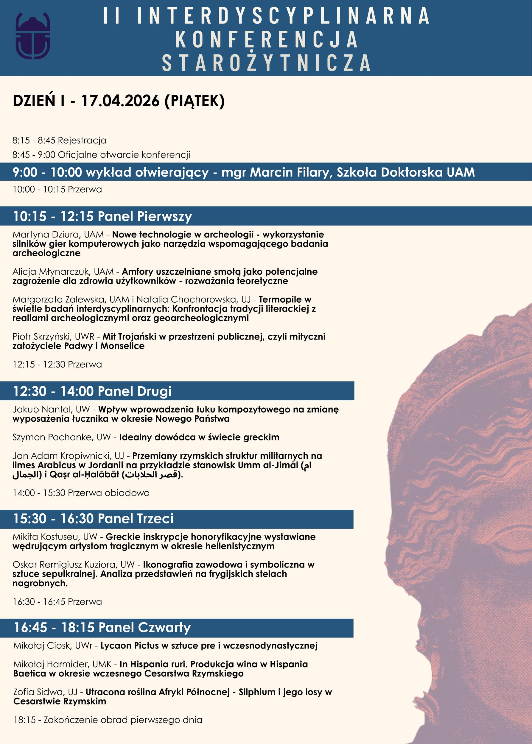 W dniach 17–18 kwietnia 2026 roku w Muzeum Archeologicznym w Poznaniu odbędzie się druga edycja Interdyscyplinarnej Konferencji Starożytniczej – wydarzenia skierowanego przede wszystkim do studentów i doktorantów zajmujących się szeroko rozumianą starożytnością. Organizatorami konferencji są Sekcja Archeologii Orientalnej i Antycznej KNSA UAM, Muzeum Archeologiczne w Poznaniu oraz Sekcja Sztuki Dawnej KNSHS UAM.
