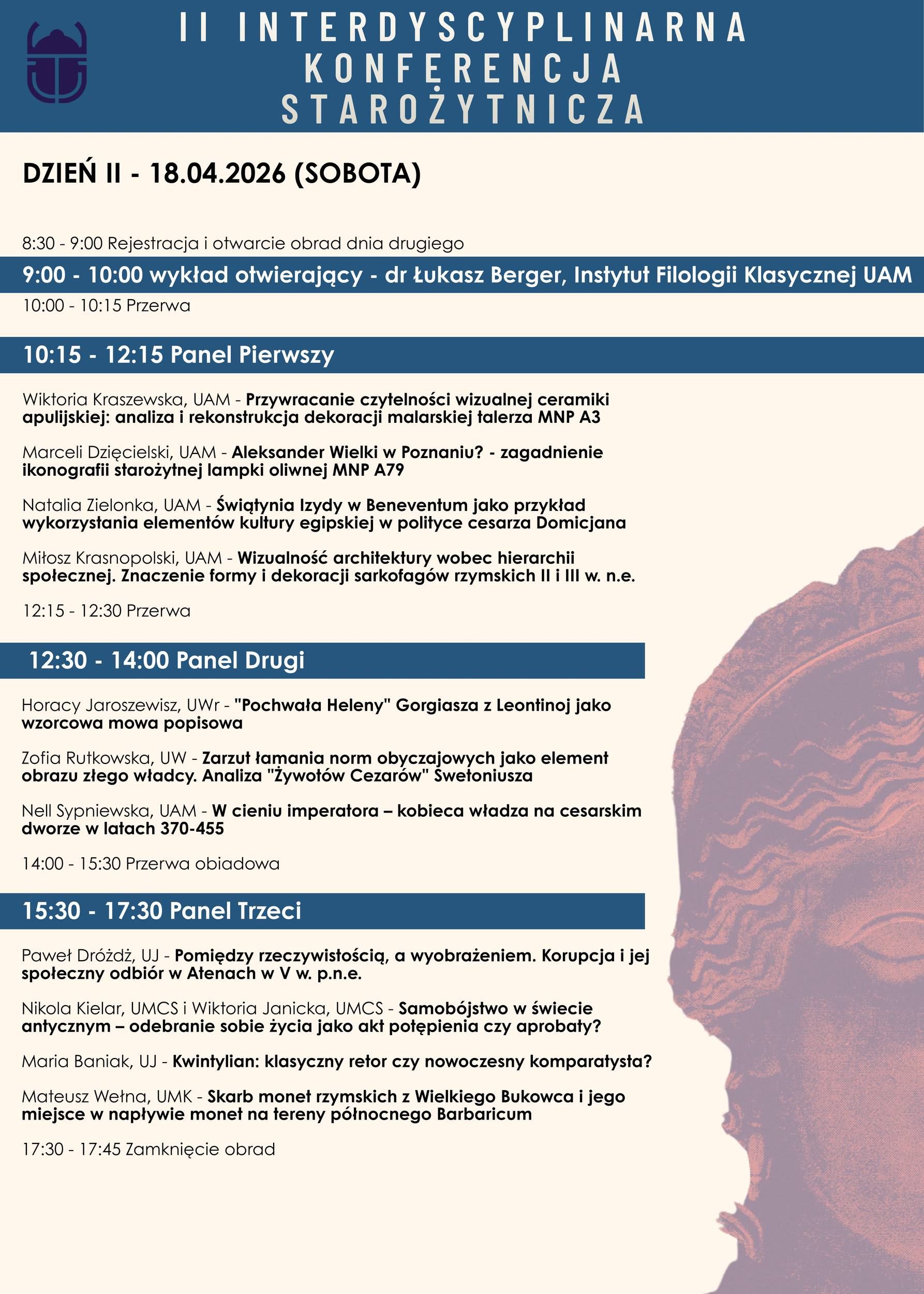 Pierwszego dnia uczestnicy wysłuchają m.in. wystąpień poświęconych wykorzystaniu nowych technologii w archeologii, reinterpretacjom wydarzeń historycznych, takim jak bitwa pod Termopilami, czy zagadnieniom związanym z militariami i gospodarką świata antycznego. Drugi dzień przyniesie referaty dotyczące sztuki, ikonografii, polityki i życia społecznego w świecie grecko-rzymskim – od analizy ceramiki i rzeźby po refleksję nad retoryką i normami obyczajowymi.